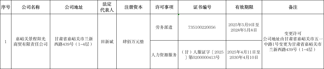 嘉峪关景程阳光商贸有限责任公司向我局提交申请变更公司地址相关材料,根据《中华人民共和国行政许可法》《中华人民共和国劳动合同法》《劳务派遣行政许可实施办法》《人力资源服务机构管理规定》的规定和要求,按照公平、公正、公开的原则,通过审查评估,嘉峪关景程阳光商贸有限责任公司符合劳务派遣变更和人力资源服务变更的相关规定和要求,准予变更。现将相关情况予以公示。