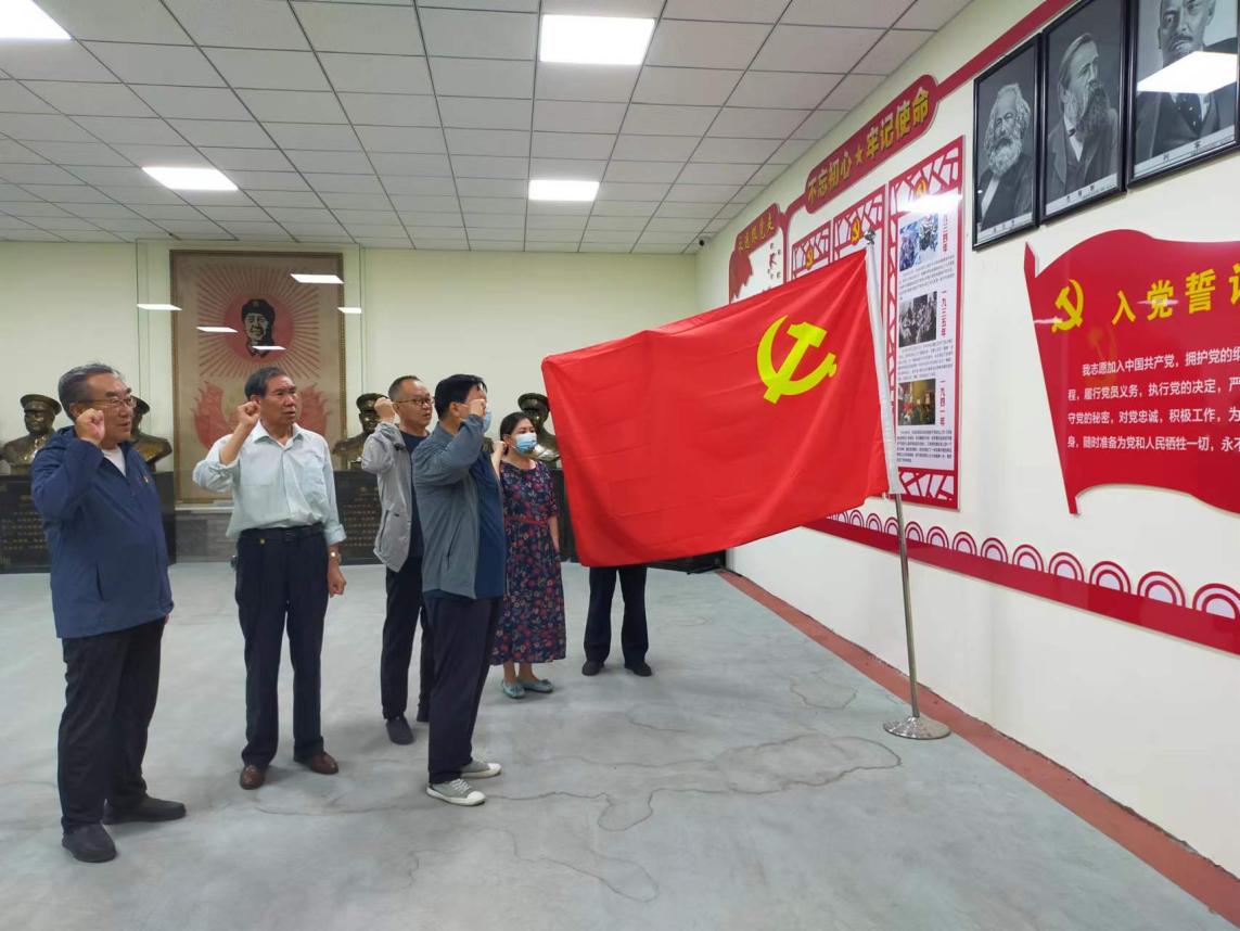 在主题党建区,党员们面对党旗庄严宣誓,重温入党誓词,牢记共产党员的政治责任和历史使命,坚定一心向党,忠诚为党的决心。