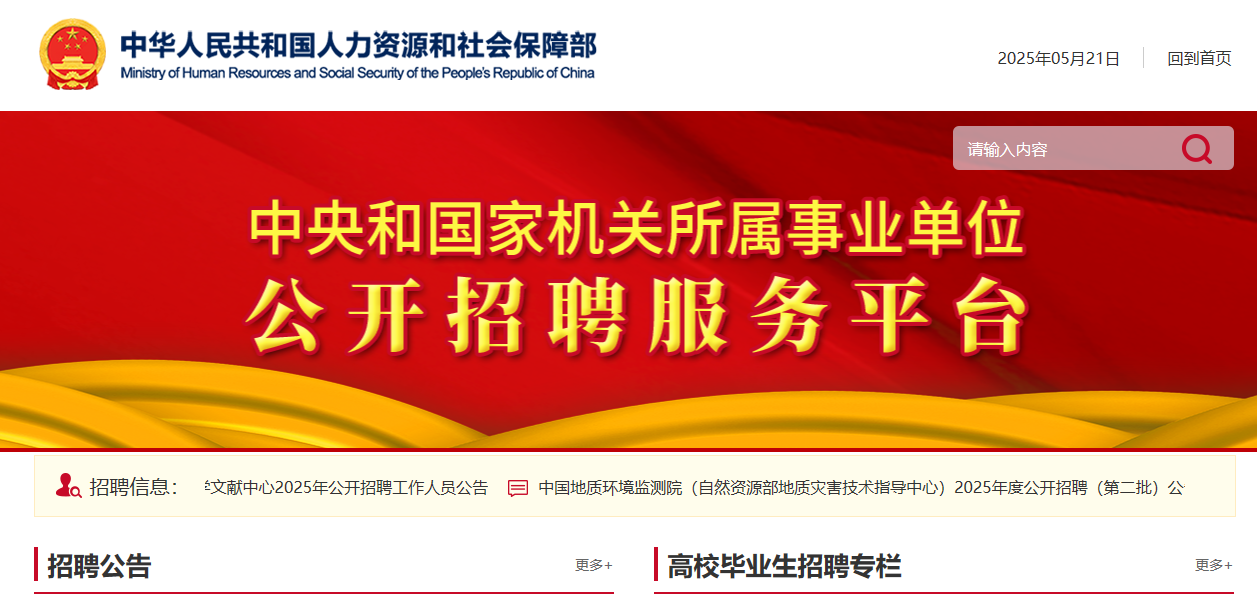 中央和国家机关所属事业单位公开招聘服务平台:https://www.mohrss.gov.cn/SYrlzyhshbzb/fwyd/SYkaoshizhaopin/zyhgjjgsydwgkzp/