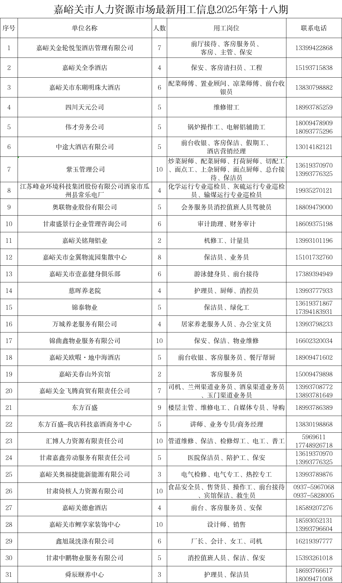 嘉峪关市人力资源市场最新用工信息2025年第十八期