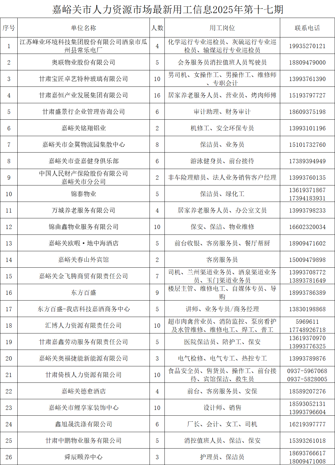 嘉峪关市人力资源市场最新用工信息2025年第十七期