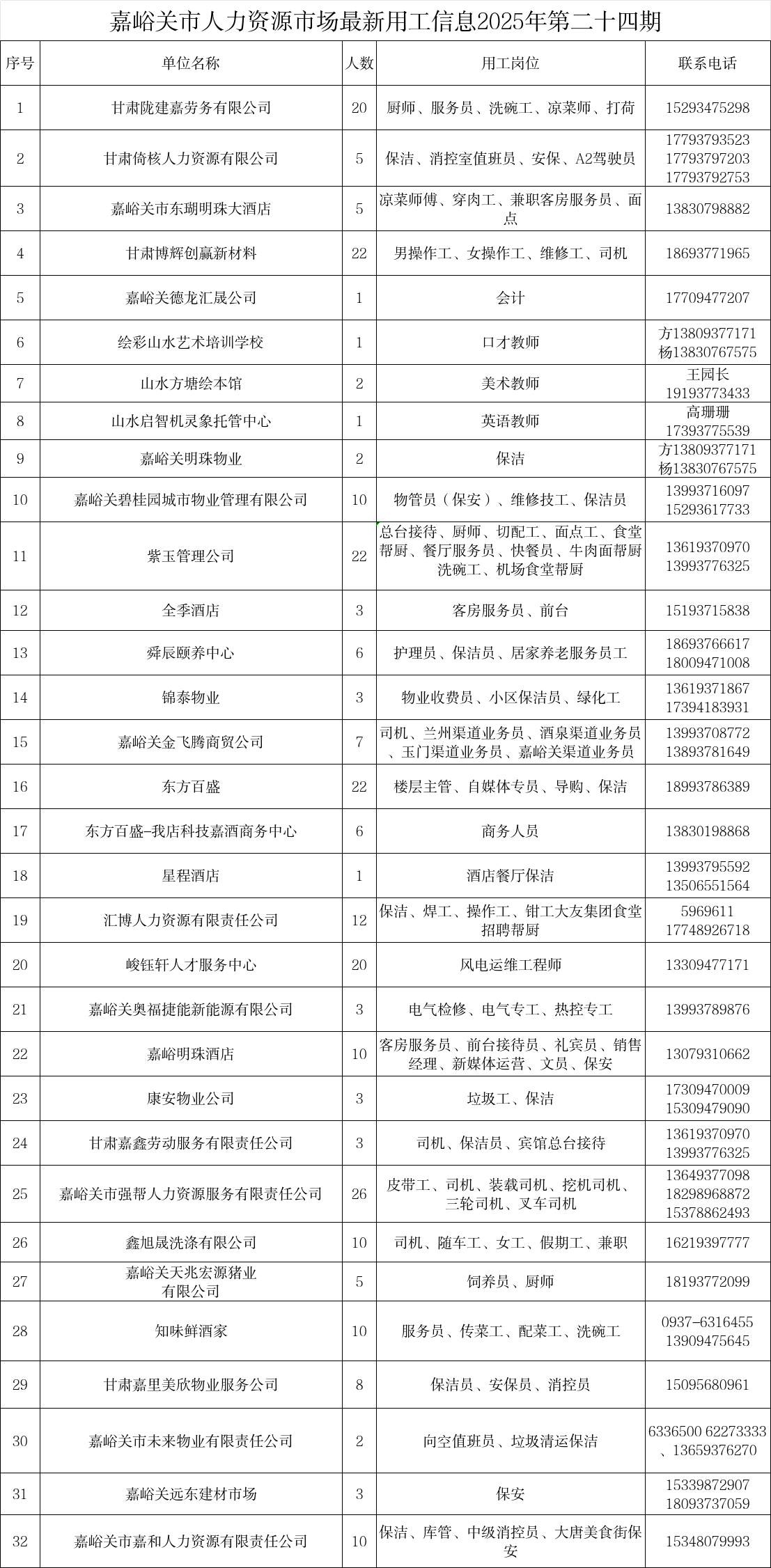 嘉峪关市人力资源市场最新用工信息2025年第二十四期