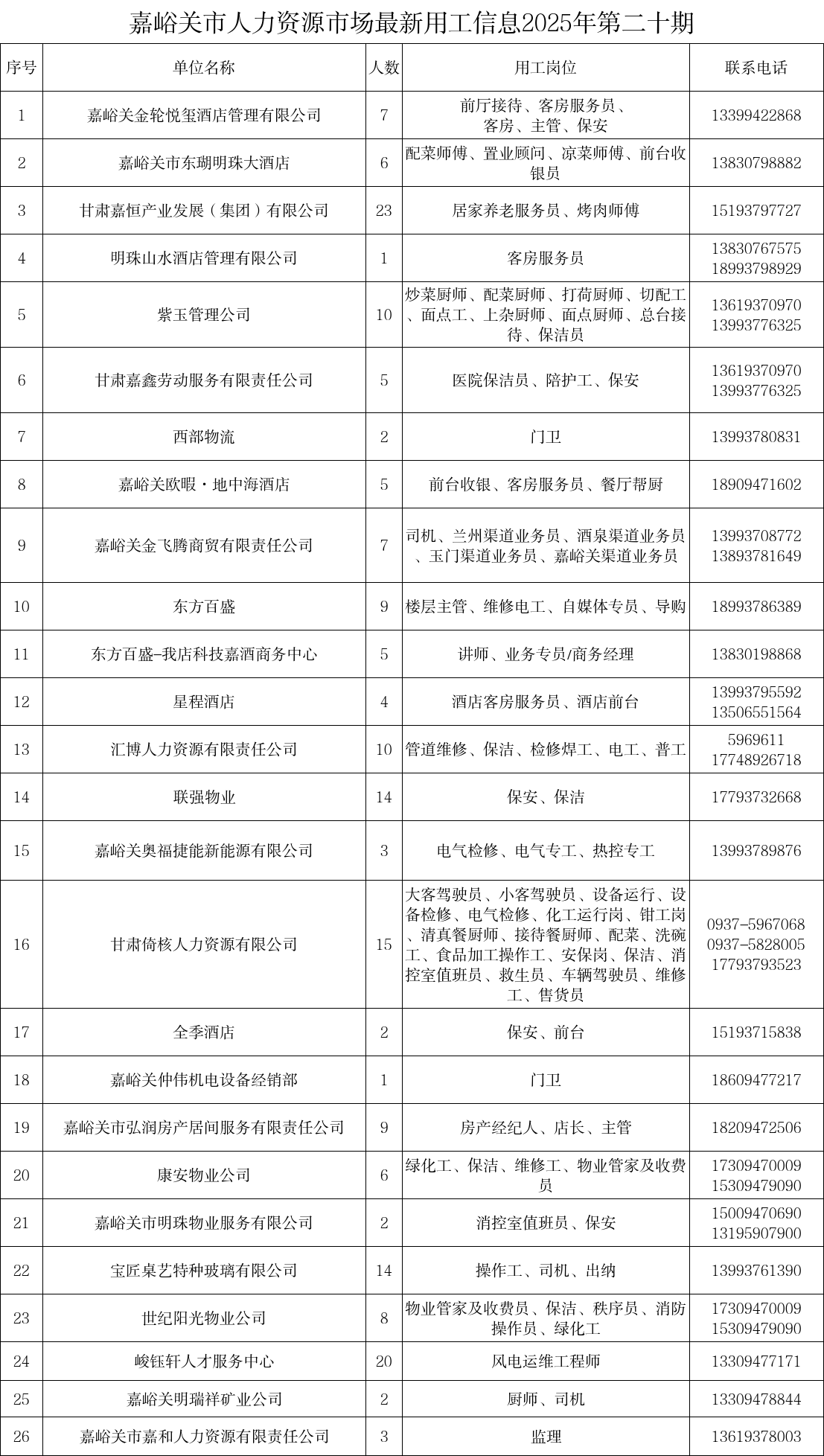嘉峪关市人力资源市场最新用工信息2025年第二十期