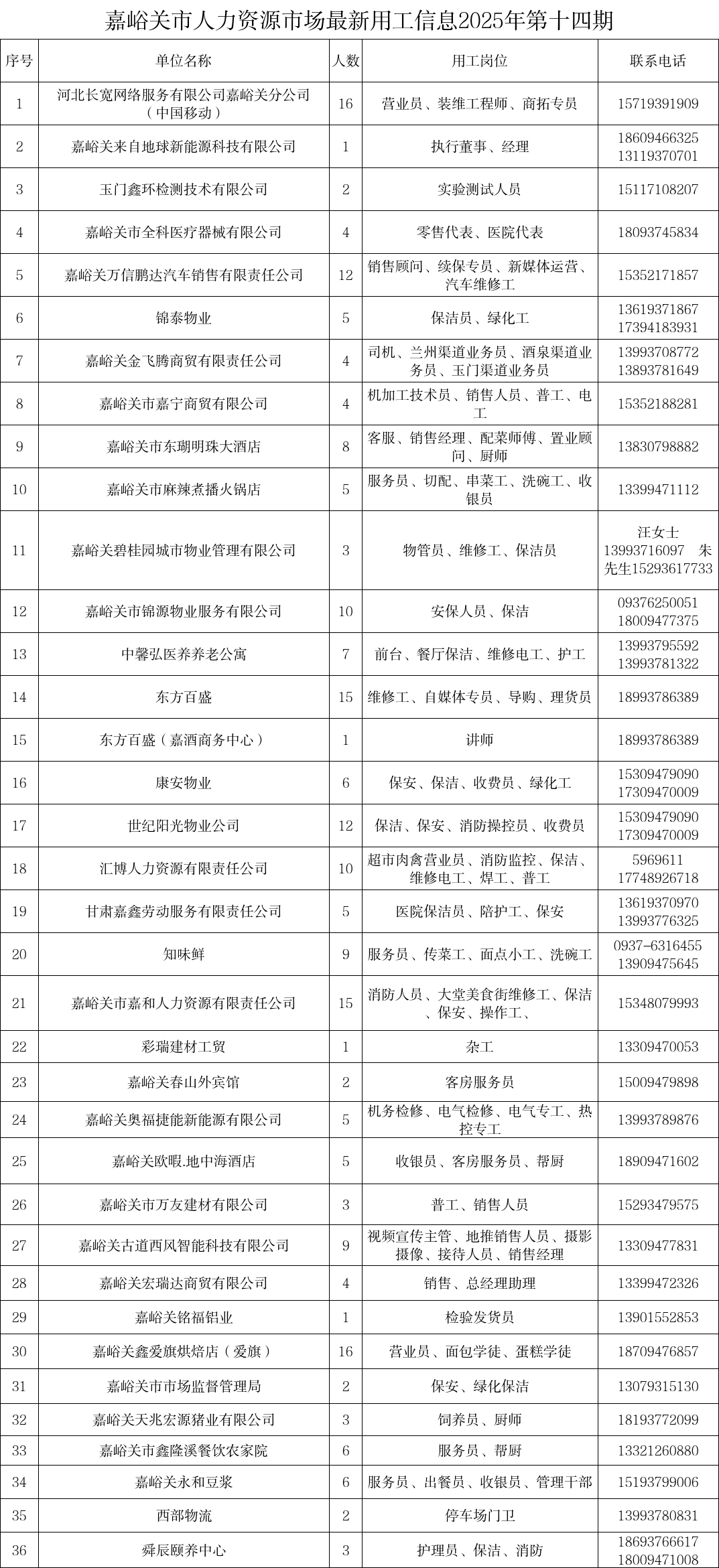 嘉峪关市人力资源市场最新用工信息2025年第十四期