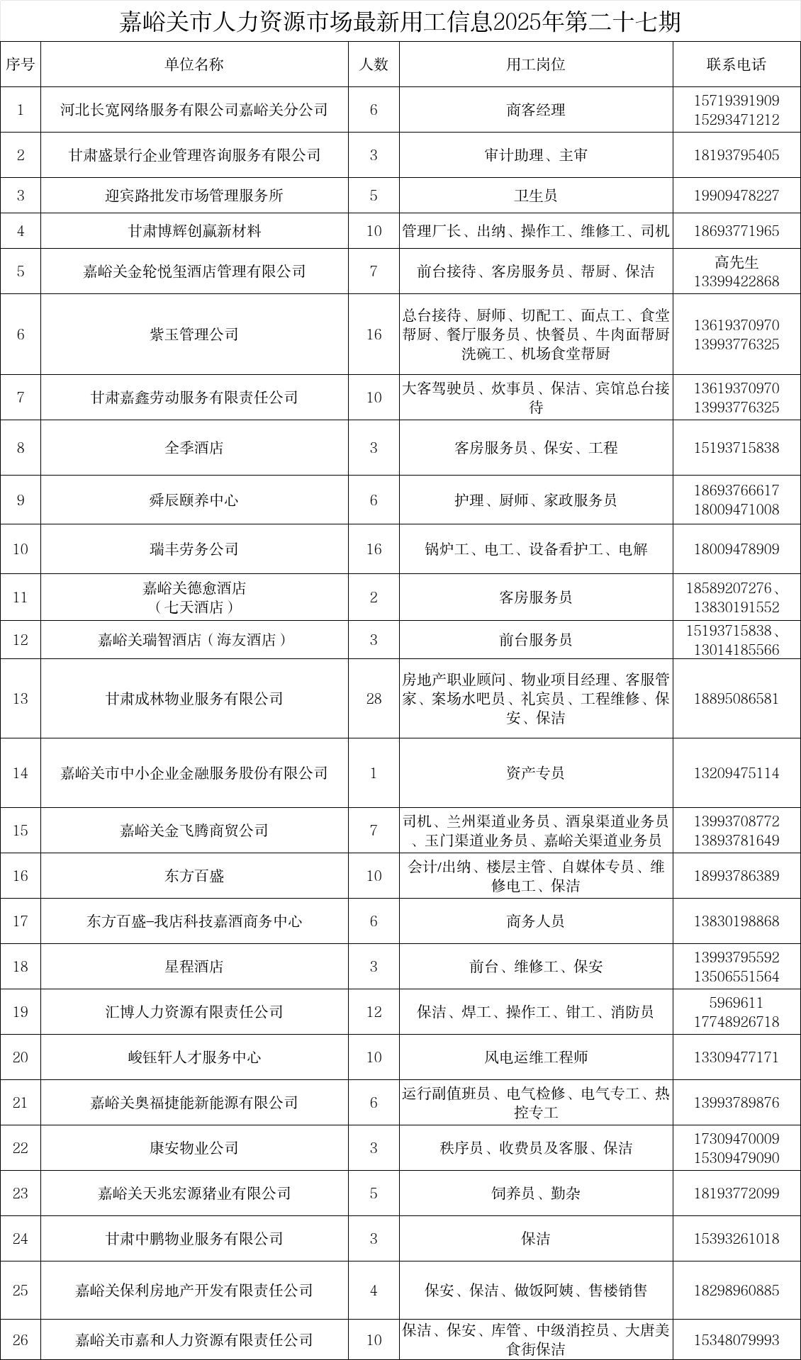 嘉峪关市人力资源市场最新用工信息2025年第二十七期