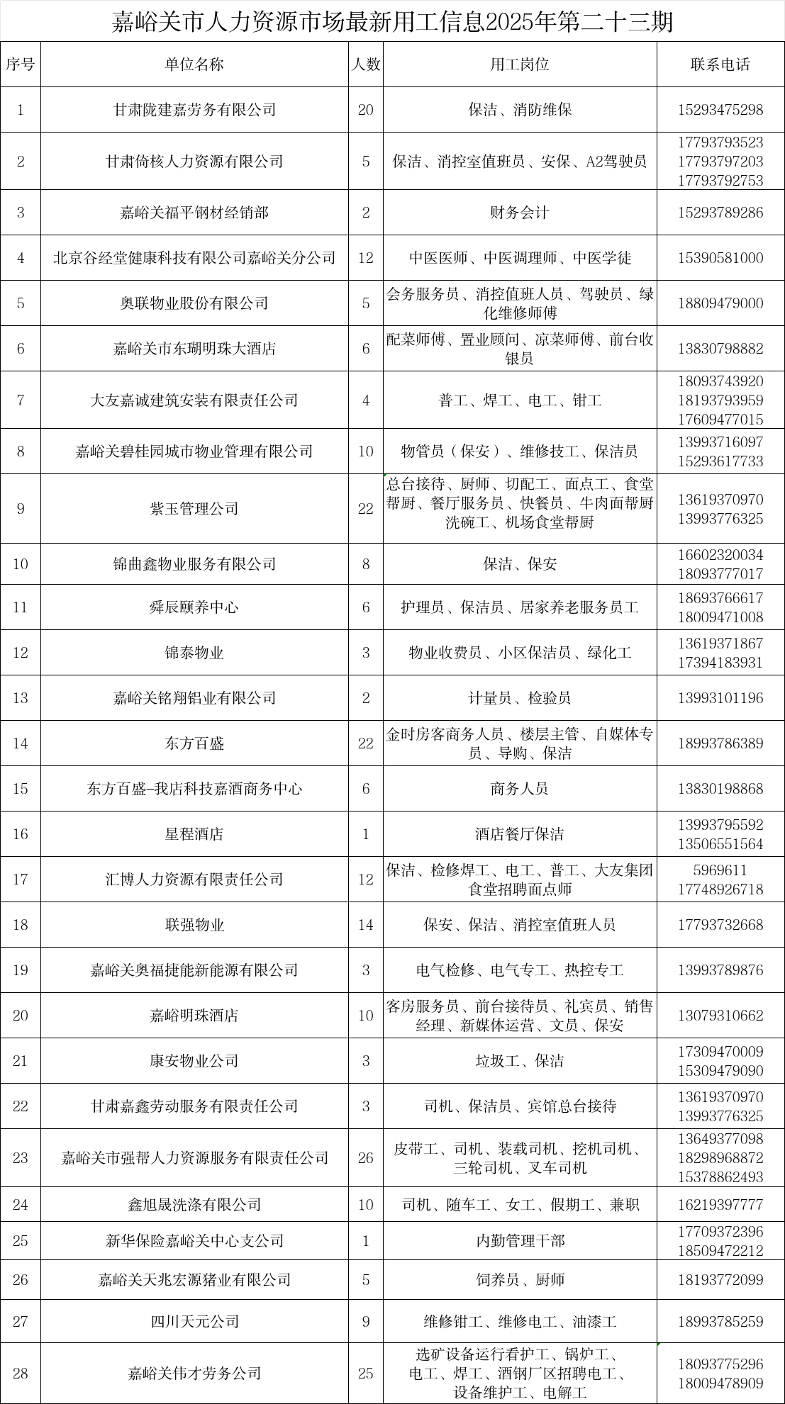 嘉峪关市人力资源市场最新用工信息2025年第二十三期
