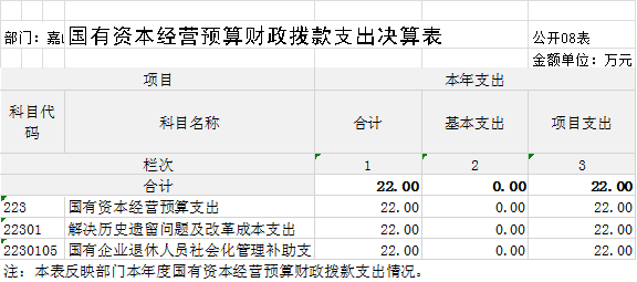 2022年度国有资本经营预算财政拨款本年支出22.00万元,主要用于国有企业退休人员社会化管理补助专项经费,保障国有企业退休人员社会化管理工作的顺利开展。
