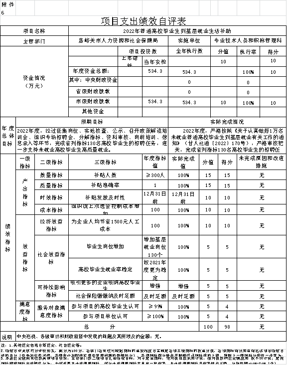 2022年普通高校毕业生到基层就业生活补助根据年初设定的绩效目标,项目总体完成情况较好。项目全年预算数为534.3万元,执行数为534.3万元,完成预算的100%。主要产出和效果:一是支持未就业高校毕业生高质量就业,二是为基层增加人才供给;