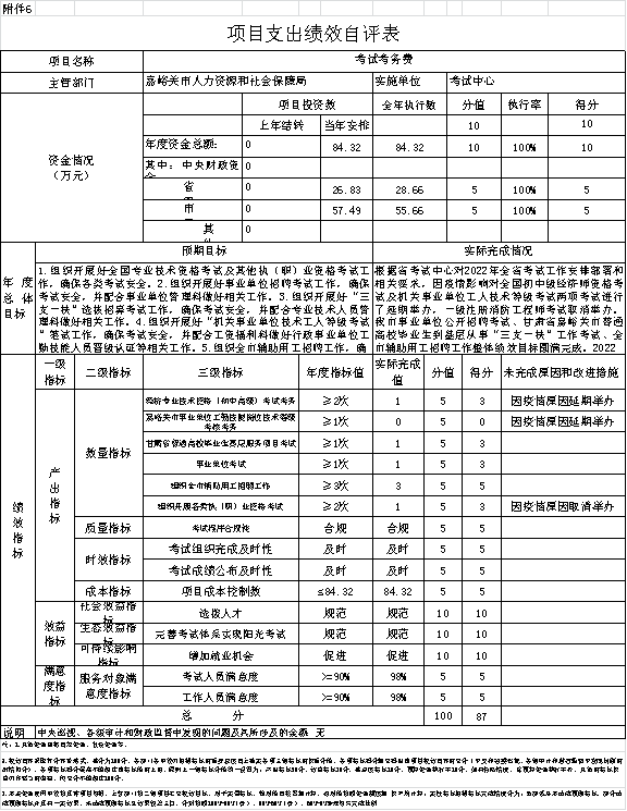 2022年人社局公开招聘考试考务费,根据年初设定的绩效目标,项目总体完成情况较好。项目全年预算数84.32万元,执行数为84.32万元,完成预算的100%。主要产出和效果:一是完成全年各项考试工作,二是营造公平环境,三是提升就业率,四是服务对象满意度达到98%以上;