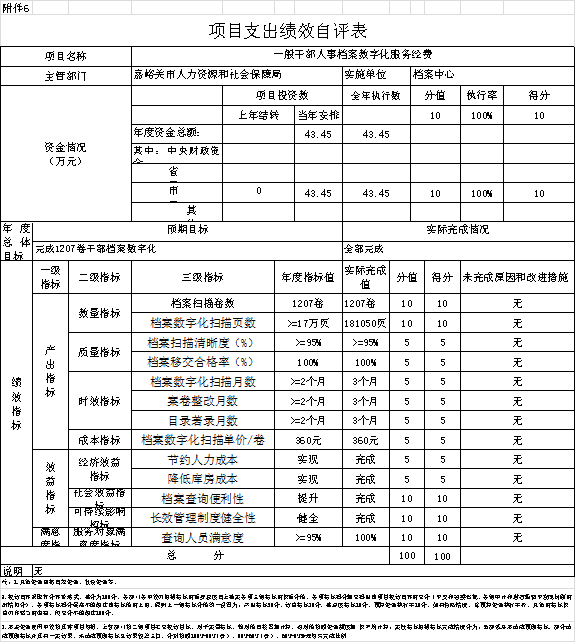 一般干部人事档案数字化服务经费,根据年初设定的绩效目标,项目总体完成情况较好。项目全年预算数为43.45万元,执行数为43.45万元,完成预算的100%。主要产出和效果:有效避免档案数据出现损毁遗失。