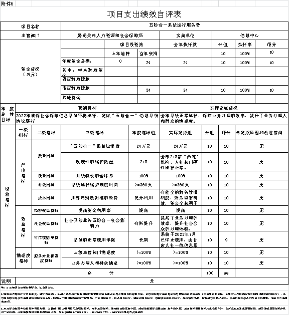 五险合一系统运行服务费,根据年初设定的绩效目标,项目总体完成情况较好。项目全年预算数为24万元,执行数为24万元,完成预算的100%。主要产出和效果:保证业务专线畅通;全年业务办理无中断;