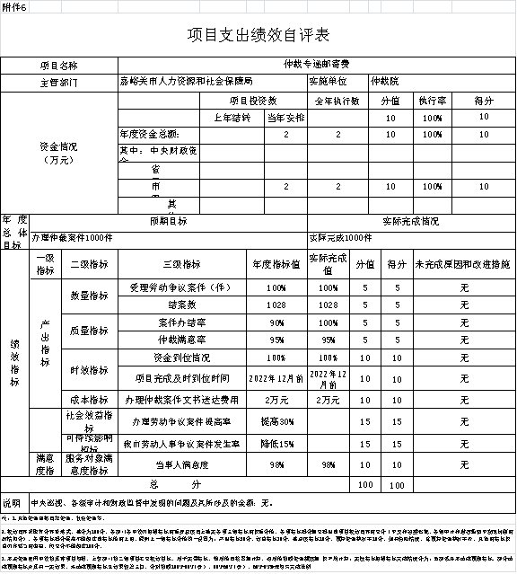 仲裁专递邮寄费,根据年初设定的绩效目标,项目总体完成情况较好。项目全年预算数为2万元,执行数为2万元,完成预算的100%。主要产出和效果:一是保证仲裁文书法律文书及时送达,二是不断加强劳动人事争议效能建设,提供高效便捷的服务水平;