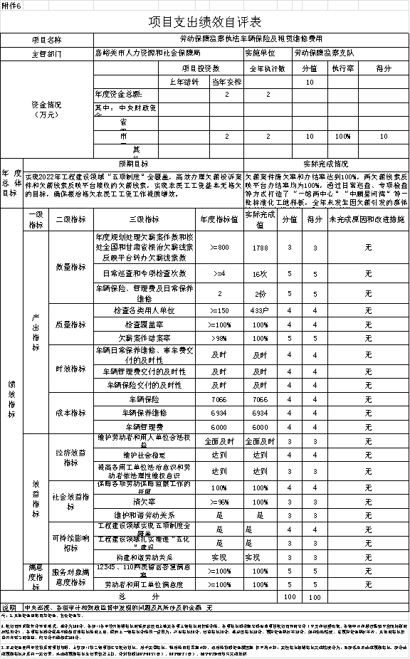 劳动保障监察执法车辆租赁费用,根据年初设定的绩效目标,项目总体完成情况较好。项目全年预算数为2万元,执行数为2万元,完成预算的100%。主要产出和效果:及时有效查处劳动违法行为,保障农民工工资发放到位,维护劳动者合法权益,保持社会稳定;