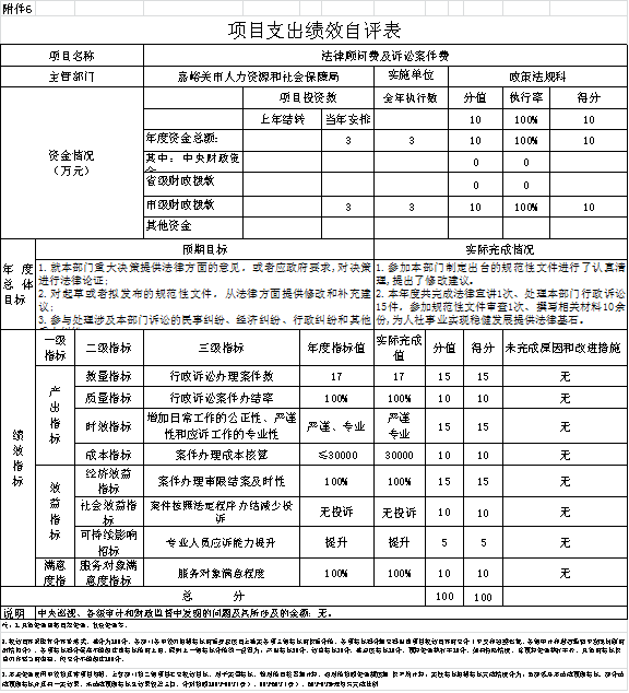 法律顾问费及诉讼案件费,根据年初设定的绩效目标,项目总体完成情况较好。项目全年预算数为3万元,执行数为3万元,完成预算的100%。主要产出和效果:一是有效避免出现违反法律法规行为,二是依法行政能力普遍增强;
