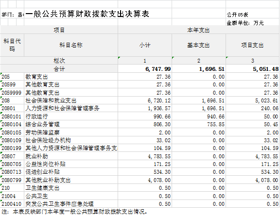 2022年度一般公共预算财政拨款支出6747.99万元,较上年决算数增加137.39万元,增长2.08%。主要原因是就业补助资金支出略有增加。
