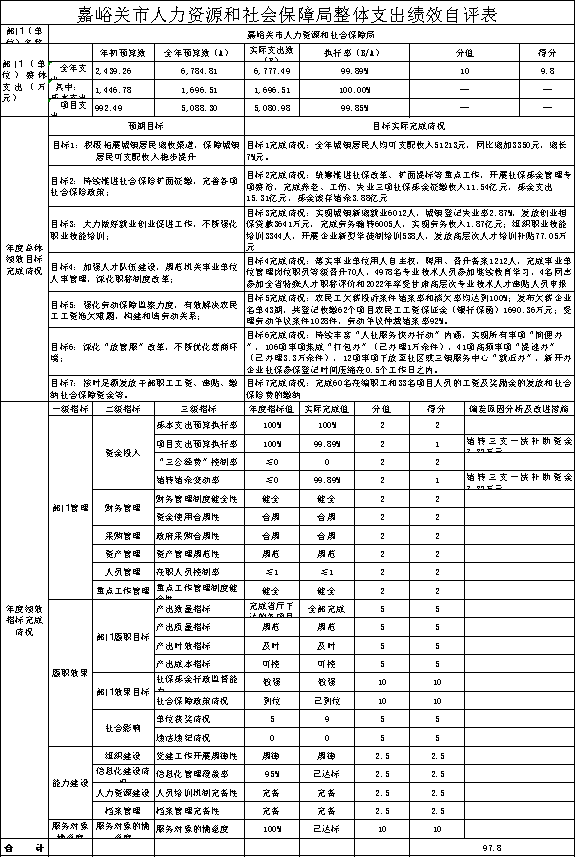 根据预算绩效管理要求,我局组织对2022年市级预算项目实施全面绩效考评,共涉及自评项目11个,预算总金额642.97万元,实际执行数642.97万元,项目资金执行完毕。项目内容涉及就业、社会保障、人才队伍、劳动关系等方面。2022年我局中央、省级转移支付项目按省厅要求统一组织开展绩效自评,未纳入市本级项目绩效自评范围。部门整体支出自评得分为97.8分,评价等级为优;