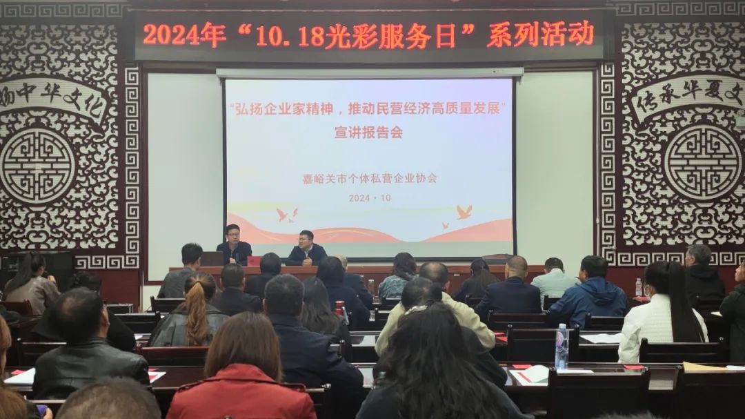 10月18日,嘉峪关市个体私营企业协会启动2024年“10·18光彩服务日”活动,并举办了主题为“弘扬企业家精神 推动民营经济高质量发展”宣讲报告会,企业代表及个私会员代表60余人聆听了宣讲报告。