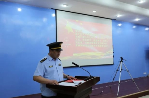 集体奏唱国歌之后,换装仪式正式开始。由执法人员代表进行发言,并宣读了《工作人员制式服装管理制度》。