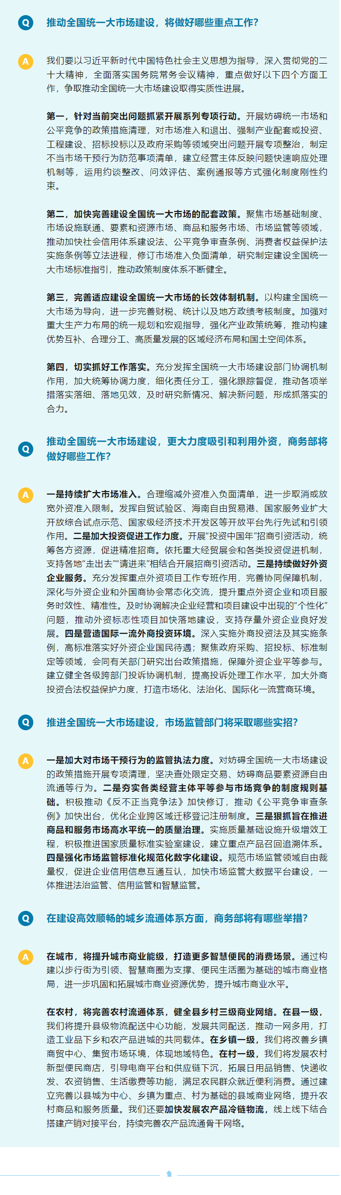 国务院新闻办公室于6月5日上午举行国务院政策例行吹风会,介绍建设全国统一大市场有关情况。在推进全国统一大市场建设方面,未来将会采取哪些举措?一起来看——