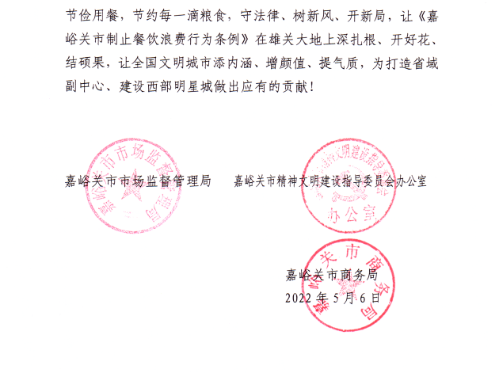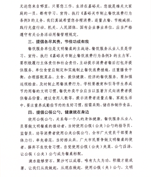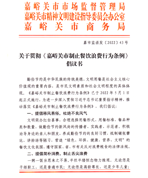 关于贯彻《嘉峪关市制止餐饮浪费行为条例》倡议书