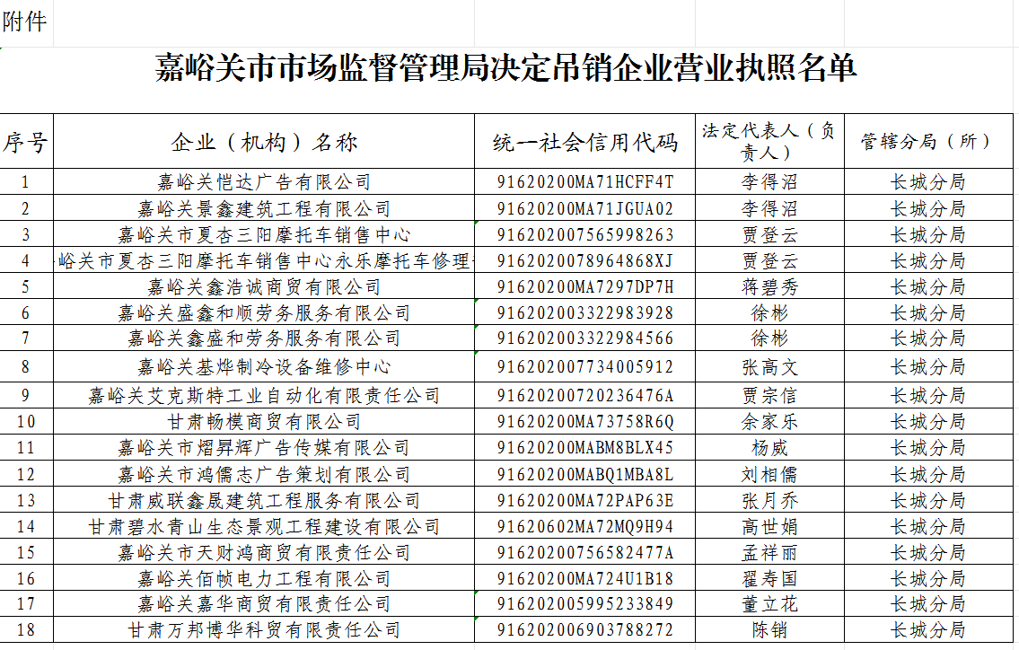 依据《市场监督管理行政处罚程序规定》第八十二条第五项的规定,现将吊销营业执照的18户企业的企业名称、统一社会信用代码、行政处罚决定书文号公告如下,自本公告发布之日起三十日视为送达,下列单位如不服本处罚决定,可在送达之日起六十日内,向嘉峪关市人民政府申请复议,也可在公告之日起六个月内,依法直接向嘉峪关市城区人民法院提起行政诉讼。复议和诉讼期间,行政处罚不停止执行。
