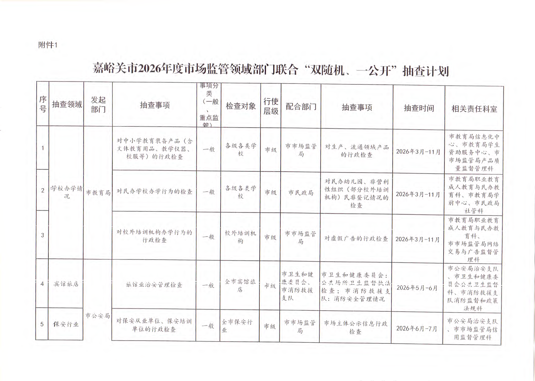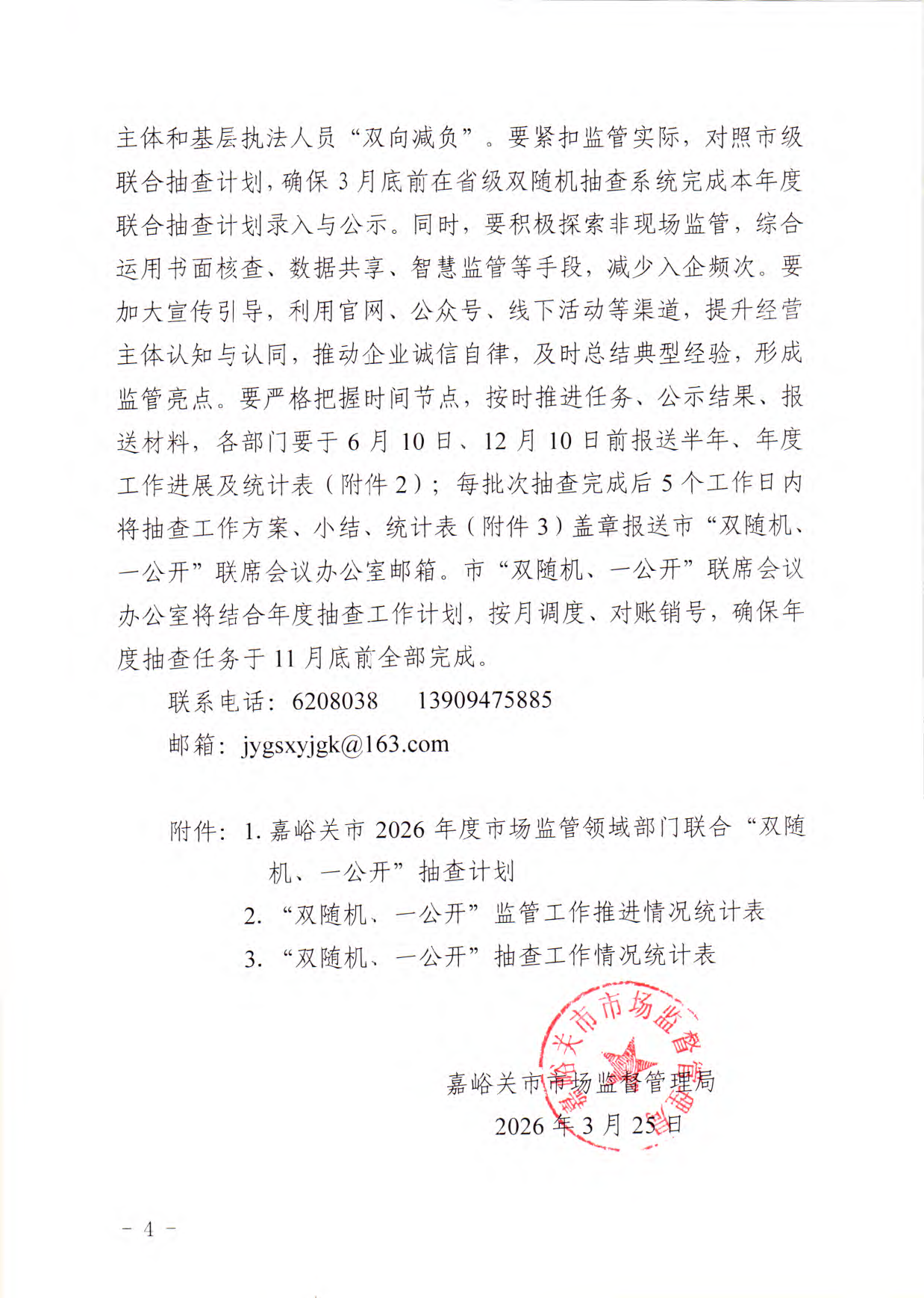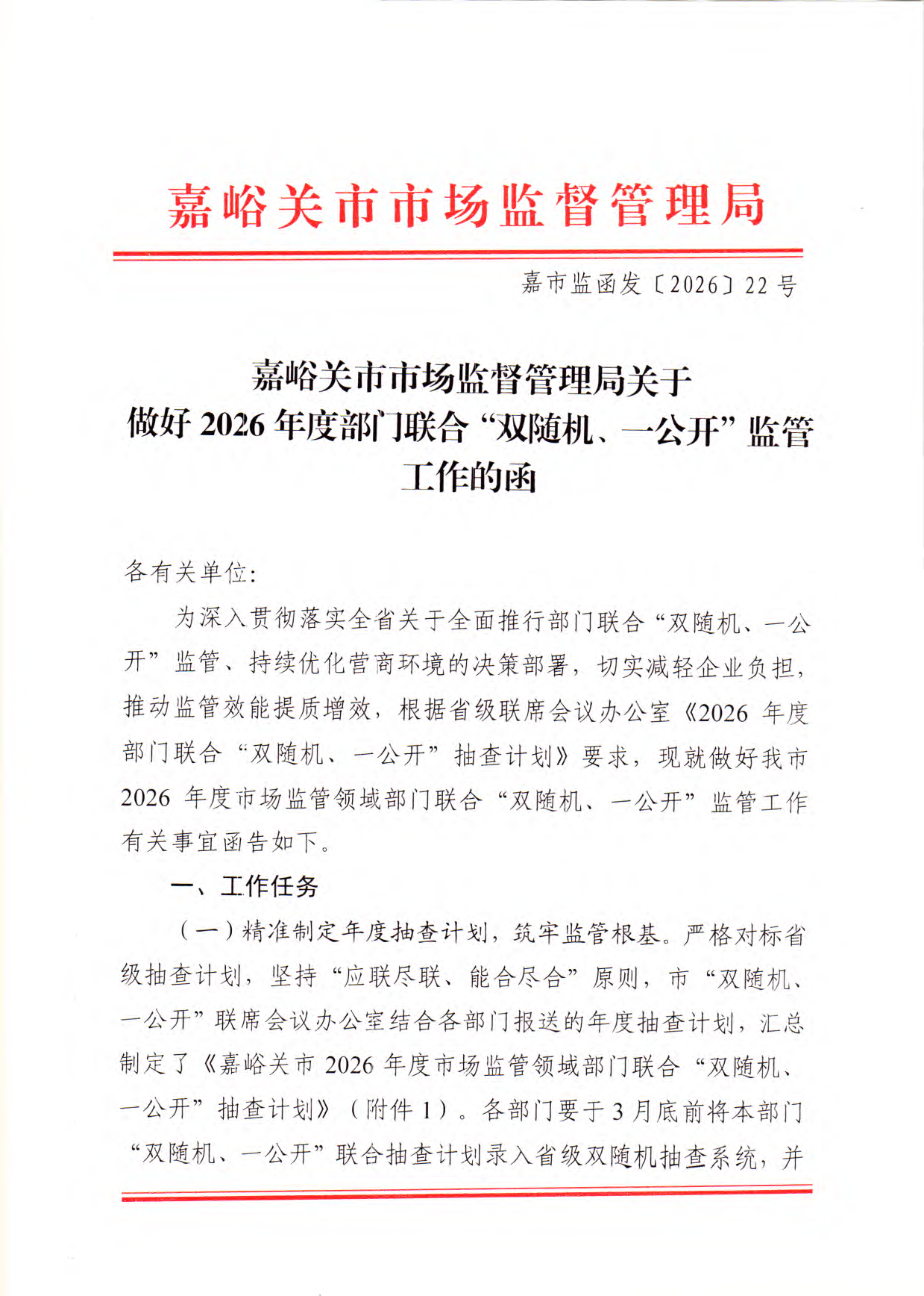 嘉峪关市市场监督管理局关于做好2026年度部门联合“双随机、一公开”监管工作的函