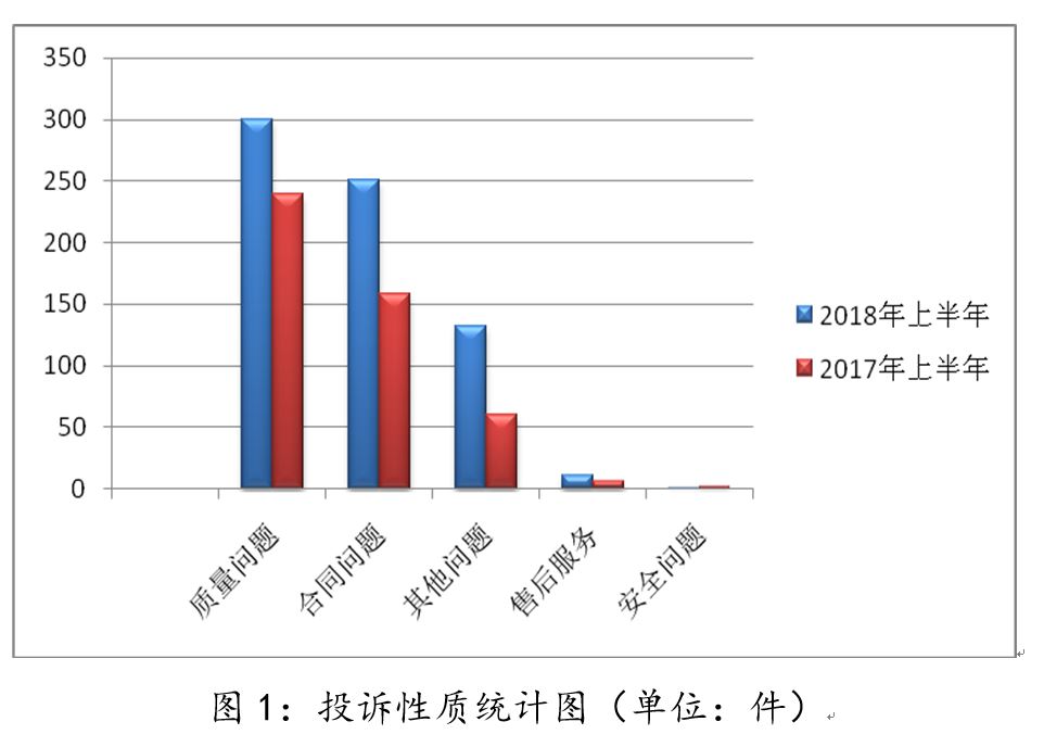 今年上半年,涉及商品类投诉中,商品的质量问题位居第一。上半年,共受理解决商品类投诉300件,占到总投诉总量的43.17%。与2017年同期239件相比,增加了23.52%。交通工具类、家用电器类、食品类、服装鞋帽类及装修建材类投诉与投诉量仍居前列。