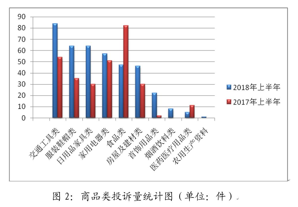 (二)商品类投诉:2018年上半年,受理解决商品类投诉398件,占到投诉总量的57.27%。与2017年同期295件相比,增加了34.92%(如表2)。而商品类投诉中,交通工具类、服装鞋帽类、日用品家具、家用电器类、食品类及房屋及建材类投诉量仍居前列,除食品类有较大幅度下降以外,其它 均呈大幅上升态势(如图2)。