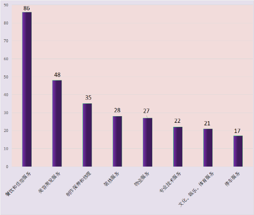 四、从服务类投诉来看,共受理服务类投396件,占受理投诉总量696件的56.9%。投诉受理量较大的服务类主要有:餐饮和住宿服务(86件)、美容美发(48件)、制作保养和修理(35件)、装修服务(28件)、物业服务(27件)、专业技术服务(22件)、文化、娱乐、体育服务(21件)、停车服务(17件),合计占服务类受理投诉量的71.7%。