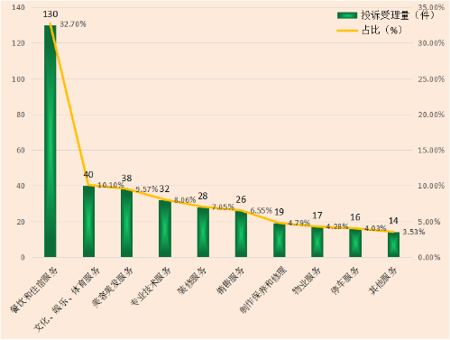 1 | 餐饮和住宿服务 | 130 | 32.7% | 餐馆服务,宾馆住宿服务,婚宴服务 | 食品安全,合同,人身权利 |