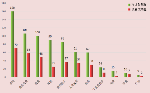 二、从投诉问题来看,受理量较大的问题主要有:合同(160件)、食品安全(106件)、质量(100件)、其他(90件)、售后服务(85件),合计占比75.6%。具体情况如下表: