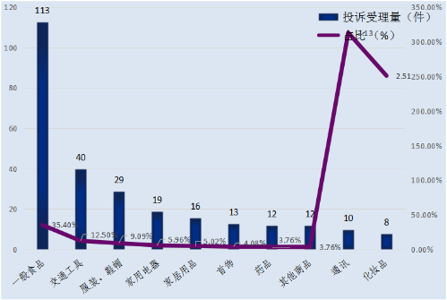 三、从商品类投诉来看,共受理商品类投诉319件,占受理投诉总量716件的44.6%。投诉受理量较大的商品主要有:一般食品(113件)、交通工具(40件)、服装、鞋帽(29件)、家用电器(19件)、家居用品(16件)、首饰(13件)、药品(12件)、其他商品(12件)、通讯(10件)、房屋(8件),合计占商品类受理总数的85.3%。