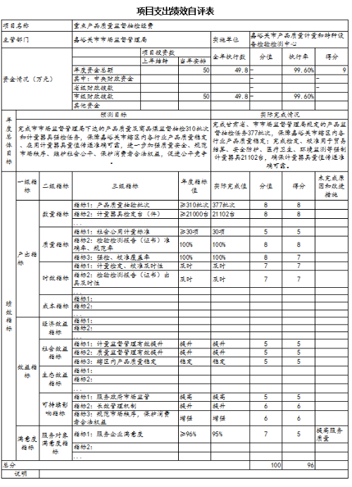 项目资金审批使用规范,支出分布合理。本次绩效自评96分,综合评价等级为优。