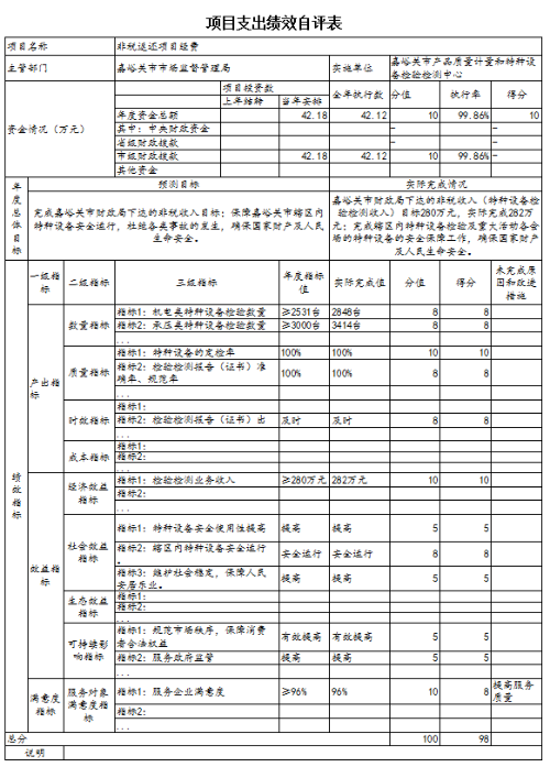 (2)非税返还项目绩效评价:2021年市财政按非税收入上缴完成282万元目标返还经费预算资金42.18万元,执行数为42.12万元,完成预算的99.86%。非税返还项目经费主要用于检验试剂耗材及检验用设备的购置,以保障特种设备检验的正常运转。