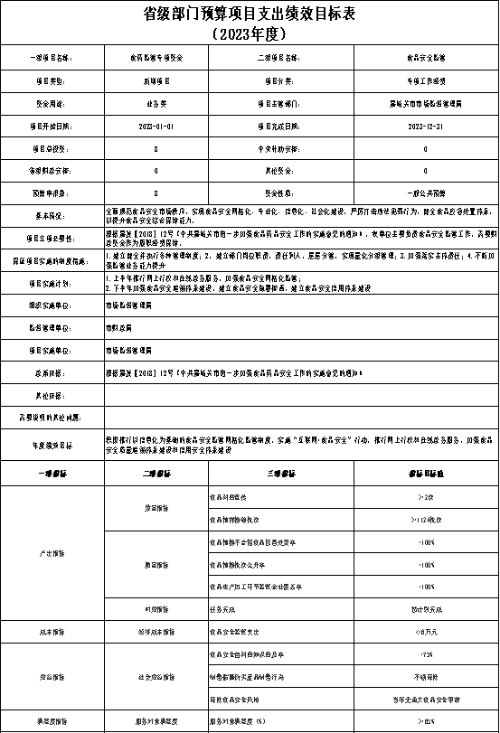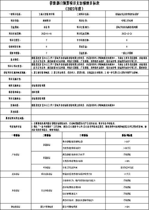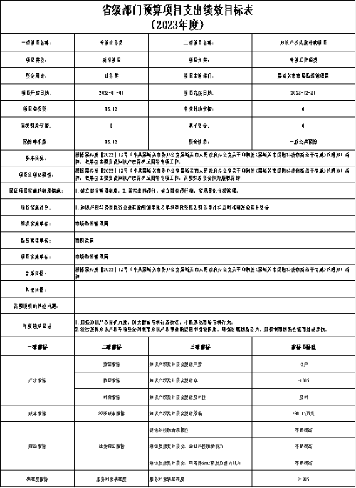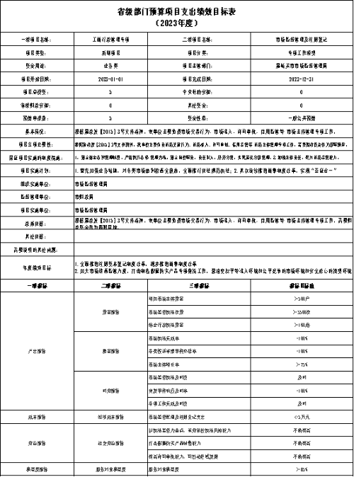 (四)2023年单位预算重点项目支出绩效目标情况。2023年部门预算纳入绩效目标管理的项目8个,主要是市场主体管理监管专项、市场秩序执法及消费者权益保护专项、药品安全监管专项、食品安全监管专项、国家食品安全示范城市创建专项、知识产权保护奖补专项、产品质量及特种设备监察专项、非公党建专项,涉及财政支出147.35万元。2023年本部门及所属1个预算单位纳入部门(单位)预算支出绩效目标管理。各项目绩效目标表如下: