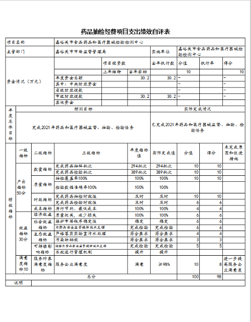 根据财政预算绩效管理要求,嘉峪关市食品药品和医疗器械检验检测中心组织对2021年度一般公共预算项目支出开展绩效评价。其中,一级项目2个,二级项目3个,共涉及资金161万元,占一般公共预算项目支出总额的54.17%。对2021年度0个政府性基金预算项目开展绩效自评,共涉及资金0万元,占政府性基金预算项目支出总额的0%。组织对2021年度0个国有资本经营预算项目开展绩效自评,共涉及资金0万元,占国有资本经营预算项目支出总额的0%。从评价情况来看,全年绩效目标全部按期、保质保量完成。