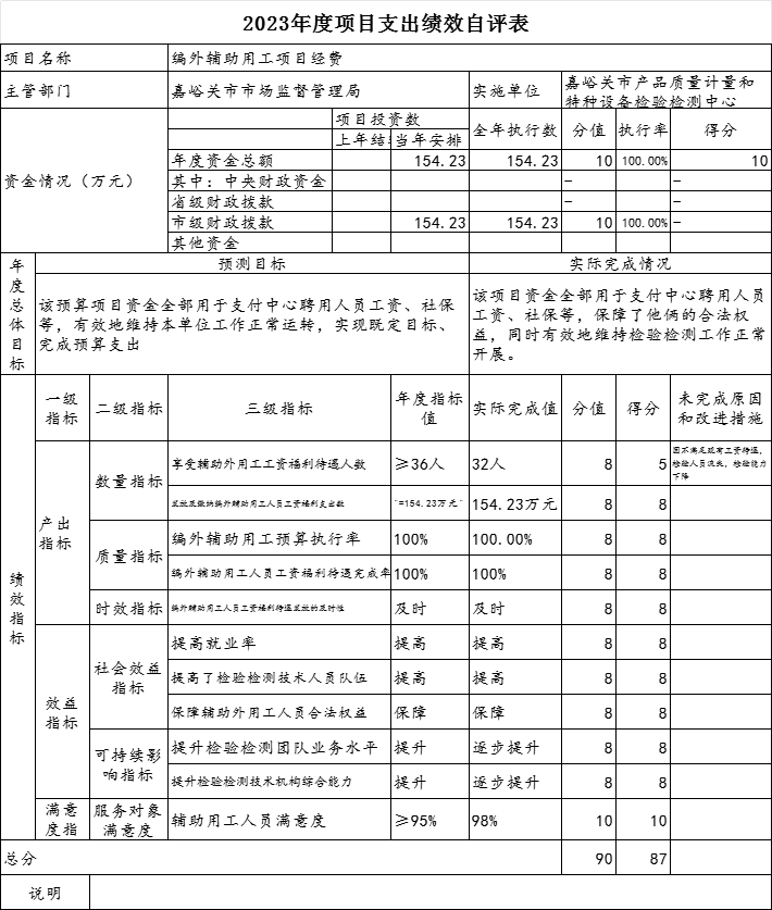 (三)“编外辅助用工人员”项目绩效自评情况:根据年初设定的绩效目标,项目绩效自评得分为97分。项目全年预算数为154.23万元,执行数为154.23万元,完成预算的100%。项目绩效目标完成情况:一是数量指标方面:2023年聘用辅助外用工人员36人,全年实际平均领用编外辅助用工工资33人;辅助外用工人员工资及社保缴费支出154.23万元,预算执行率为100%。二是质量指标方面:编外辅助用工人员工资发放率、编外辅助用工人员社会保险缴纳率均为100%,达到了年初设定的绩效目标。三是社会效益指标方面:通过对该项目的实施,保障了编外辅助岗位人员的合法权益,减少了人才流失,壮大了检测检测人员队伍,提高了工作效率。发现的主要问题及原因:“享受辅助外用工工资福利待遇人数”偏离绩效目标的原因:2023年从中心离职检验3人,由于中心财政预算指标有限,中心已最大程度提高辅助岗位人员的工资福利待遇,但还是比不上综合四0四核基地有限公司的福利待遇。下一步改进措施:一是争取更多的财政预算资金,加强人才培训,建立健全人才队伍管理;二是加大行政事业性收费,以收定支,进可能提高辅助岗位人员待遇,减少人才流失。