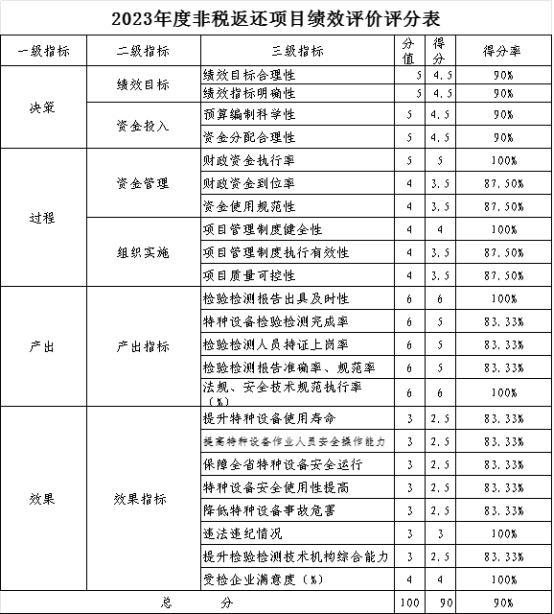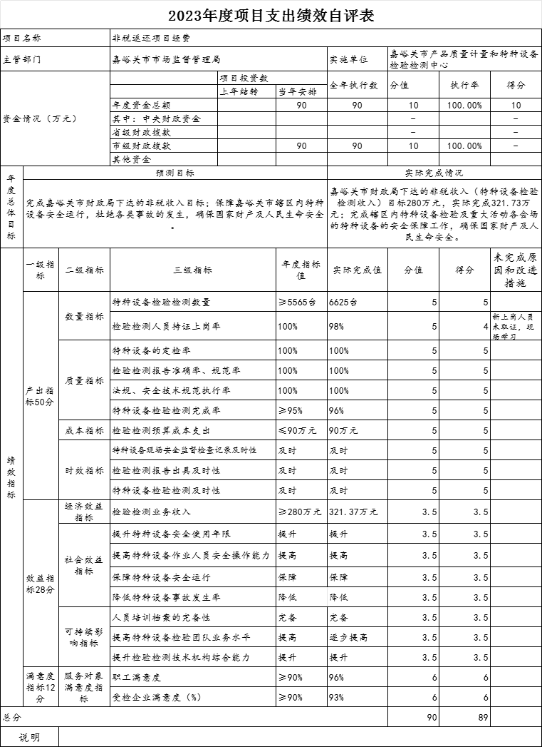 (二)“非税收入返还”项目绩效自评情况:根据年初设定的绩效目标,项目绩效自评得分为99分。项目全年预算数为90万元,执行数为90万元,完成预算的100%。项目绩效目标完成情况:一是数量指标方面:完成特种设备承压类检验检测数量6625台,检验检测人员持证上岗率99%,各项指标均完成计划目标。二是质量指标方面:特种设备的定检率100%,检验检测报告(证书)准确率、规范率100%,特种设备检验检测完成率100%,法规、安全技术规范执行率100%,各项指标均完成预期目标。三是社会效益指标方面:通过项目的实施,提升了特种设备使用寿命,提高了特种设备作业人员安全操作能力,保障辖区内特种设备安全运行,降低特种设备事故危害,维护社会稳定,保障人民安居乐业。发现的主要问题及原因:检验检测人员持证上岗率为99%,低于年初目标设定值。由于检验检测人员培训取证是由国家特种设备培训考试中心安排,个别刚参加工作的人员检验检测证未能取证,由老同志“传帮带”领着现场学习。下一步改进措施:加强检验检测人员取证上岗培训进度,提升检验检测能力建设。