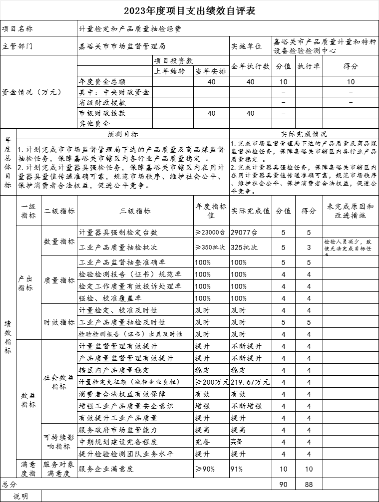 (一)“产品计量检定和质量抽检”项目绩效自评情况:根据年初设定的绩效目标,本项目绩效自评得分为98分。项目全年预算数为40万元,执行数为40万元,完成预算的100%。项目绩效目标完成情况:一是数量指标方面,完成市级工业产品质量监督抽查批次325。其中:完成煤炭专项抽查120批次,合格118批次,合格率98.3%,;市级监督抽查125批次,合格116批次,总体合格率92.8%;风险监测10批次,合格10批次,合格率100%;委托检验70批次,合格66批次,合格率94.2%。共抽检产品质量325批次。二是质量指标方面:2023年检验检测报告(证书)准确率、规范率、检定工作质量有效投诉处理率、强检、校准覆盖率均达到100%,各项指标均完成预期目标。三是时效指标方面:中心按照时间节点要求,在计量检定、工业产品质量抽检、校准和检验检测报告出具等工作均及时完成。四是效益指标完成情况分析。通过项目的实施,计量监督管理有效提升、产品质量监督管理有效提升、辖区内产品质量稳定、计量检定免征额,减轻了企业负担,未发生安全事件。发现的主要问题及原因:“工业产品质量抽检批次”偏离绩效目标,主要原因是由于检验检测技术人员流失,检验队伍人力不足,一定程度上影响了检验检测工作,致使工业产品质量抽检批次未达到年初设定的绩效目标。下一步改进措施:进可能提高检验检测人员工资福利待遇,加强人才的引进和培养,进一步提高检验检测队伍建设。