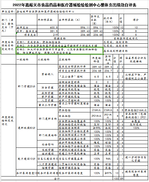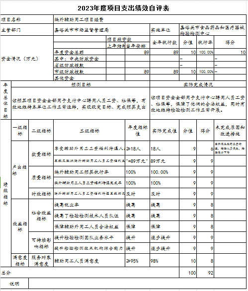 3.“编外辅助用工人员经费”项目绩效自评情况:根据年初设定的绩效目标,项目绩效自评得分为92分。项目全年预算数为89万元,执行数为89万元,完成预算的100%。项目绩效目标完成情况:一是该预算项目资金全部用于支付中心聘用人员工资、社保,有效地维持本单位工作正常运转,实现既定目标,以便更好的完成食品、药品的检验检测任务。本年度完成食品抽样2714批次,完成预期100%,达到年初计划目标。药品抽样161批次,药品检验216批次。完成预期100%,达到年初计划目标。 存在的不足: 编外人员在聘用之后,竞争机制还不够完善,在人才队伍建设方面还存在不足之处。