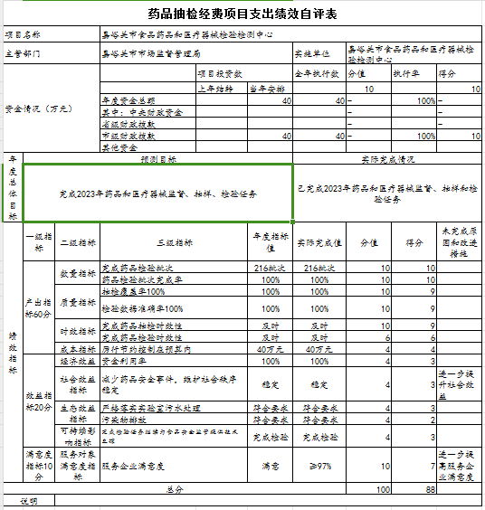 1.“药品抽检经费”项目绩效自评情况:根据年初设定的绩效目标,项目绩效自评得分为89分。项目全年预算数为40万元,执行数为40万元,完成预算的100%。项目绩效目标完成情况:完成2023年药品和医疗器械监督、抽样、检验任务,药品监督检验工作均按照省级药品抽检计划及嘉峪关市级计划的要求安排实施。检验工作均严格按照现行有效的检验标准开展。检验报告准确及时,报告合格率100%。