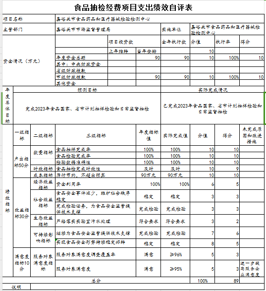 食品抽检业务经费项目评价得分为89分。评价等级为“良好”。
