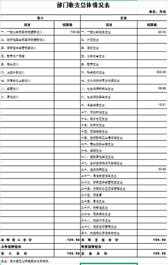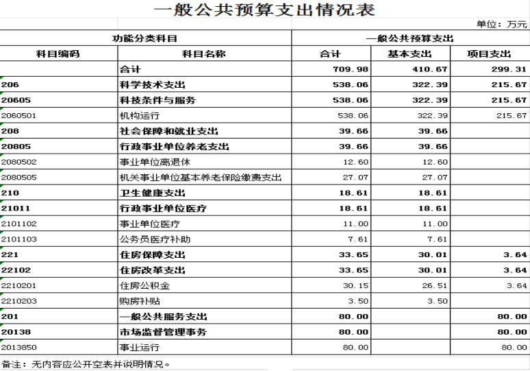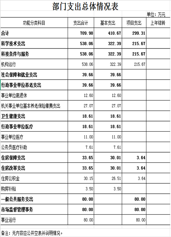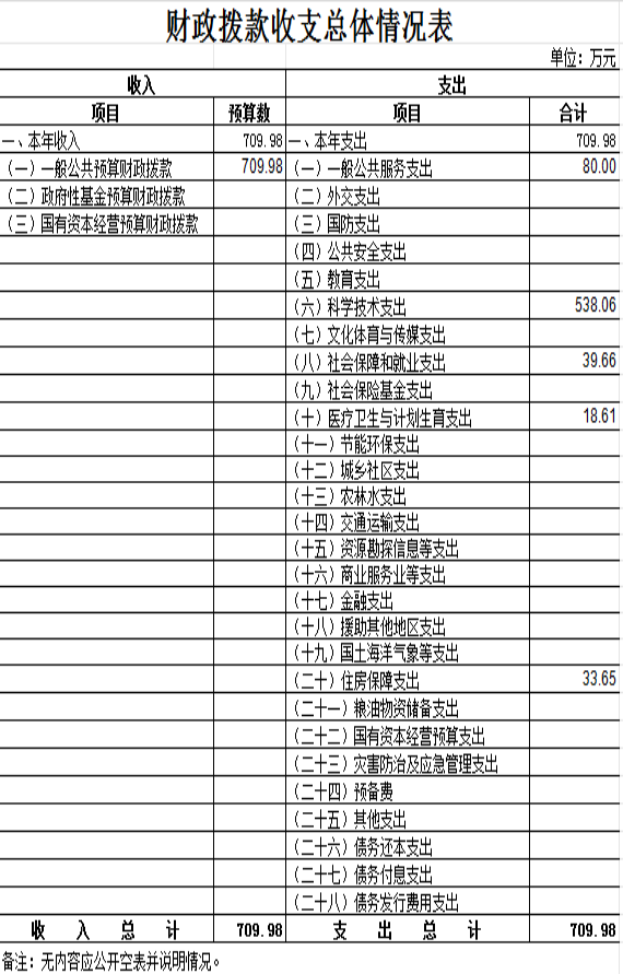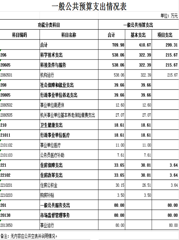 2024 年一般公共预算当年支出 709.98 万元,包括:一般公共服务支出 80万元、科学技术支出 538.06 万元、社会保障和就业支出 39.66 万元、卫生健康支出18.61万元、住房保障支出33.65万元。具体安排情况如下(详见部门预算公开表4,5,6,7):