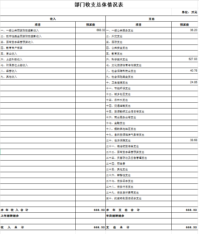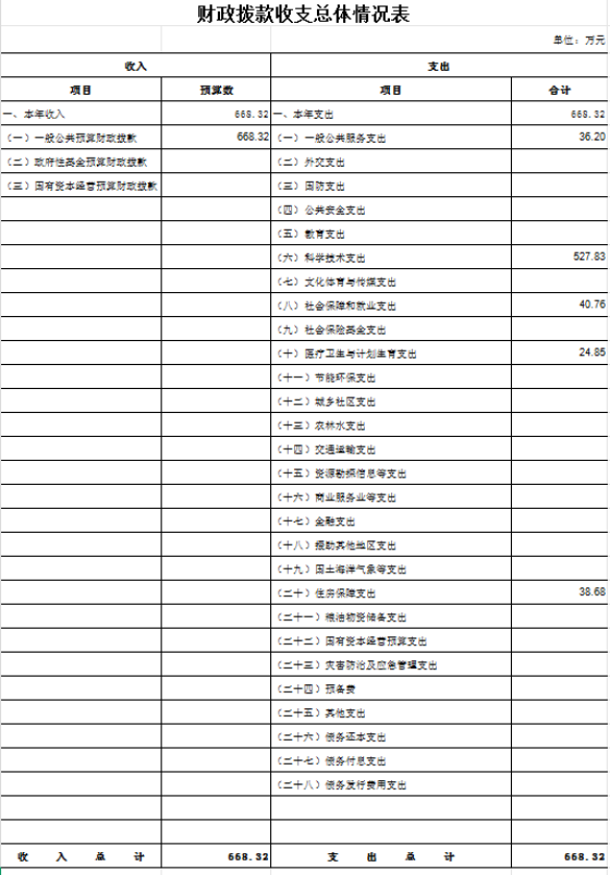 2025年部门收支总预算668.32万元。按照综合预算的原则,部门所有收入和支出均纳入部门预算管理。收入包括:一般公共预算拨款收入、政府性基金预算拨款收入、事业收入、事业单位经营收入、其他收入、使用非财政拨款结余、上年结转;支出包括:一般公共服务支出、公共安全支出、教育支出、科学技术支出、社会保障和就业支出、卫生健康支出、交通运输支出、住房保障支出、其他支出。