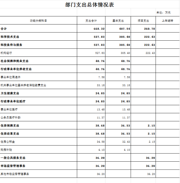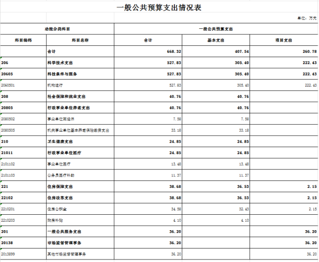 2025年一般公共预算当年支出668.32万元,包括:一般公共服务支出36.2万元、科学技术支出527.83万元、社会保障和就业支出40.76万元、医疗卫生与计划生育支出24.85万元、卫生健康支出38.68万元,其他支出0万元。具体安排情况如下(详见部门预算公开表4,5,6,7):