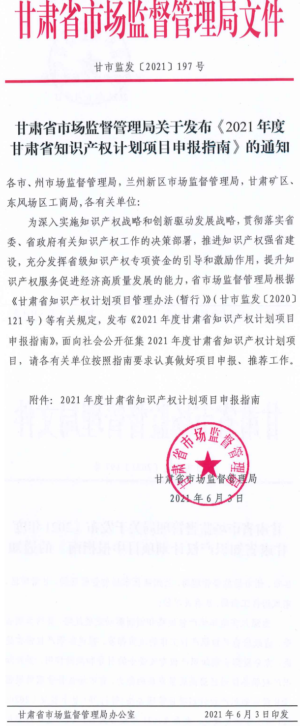 《2021年度甘肃省知识产权计划项目申报指南》