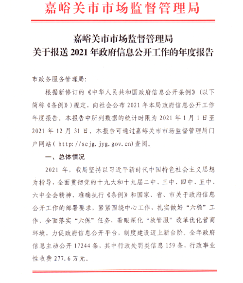 嘉峪关市市场监督管理局2021年政府信息公开工作年度报告