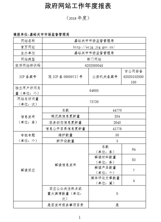 嘉峪关市市场监督管理局2018年度政府网站年度工作报表