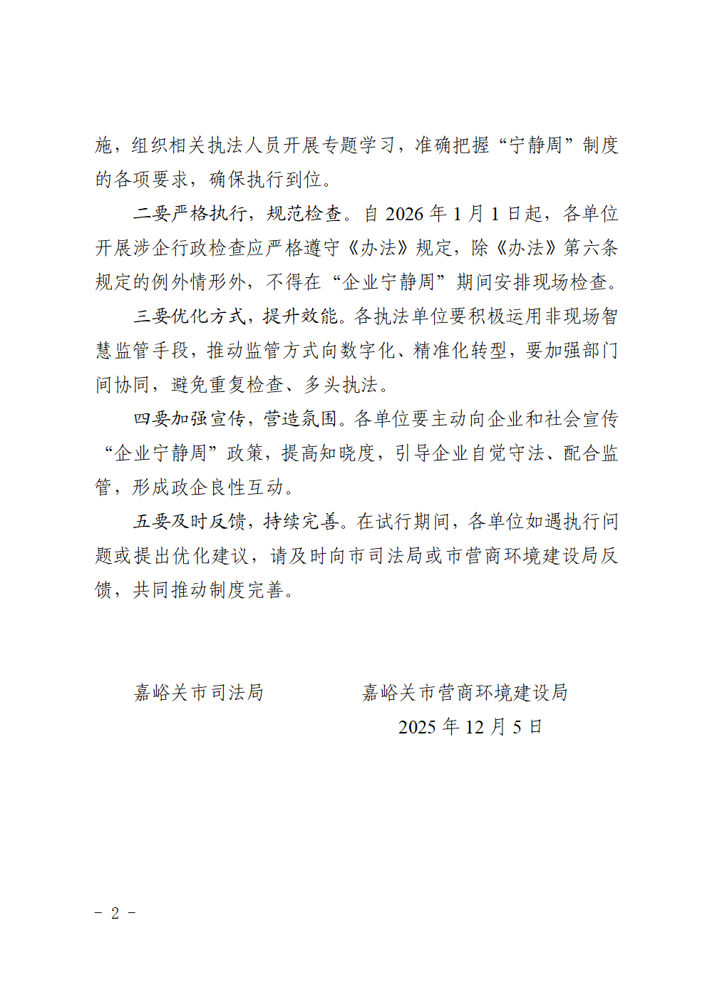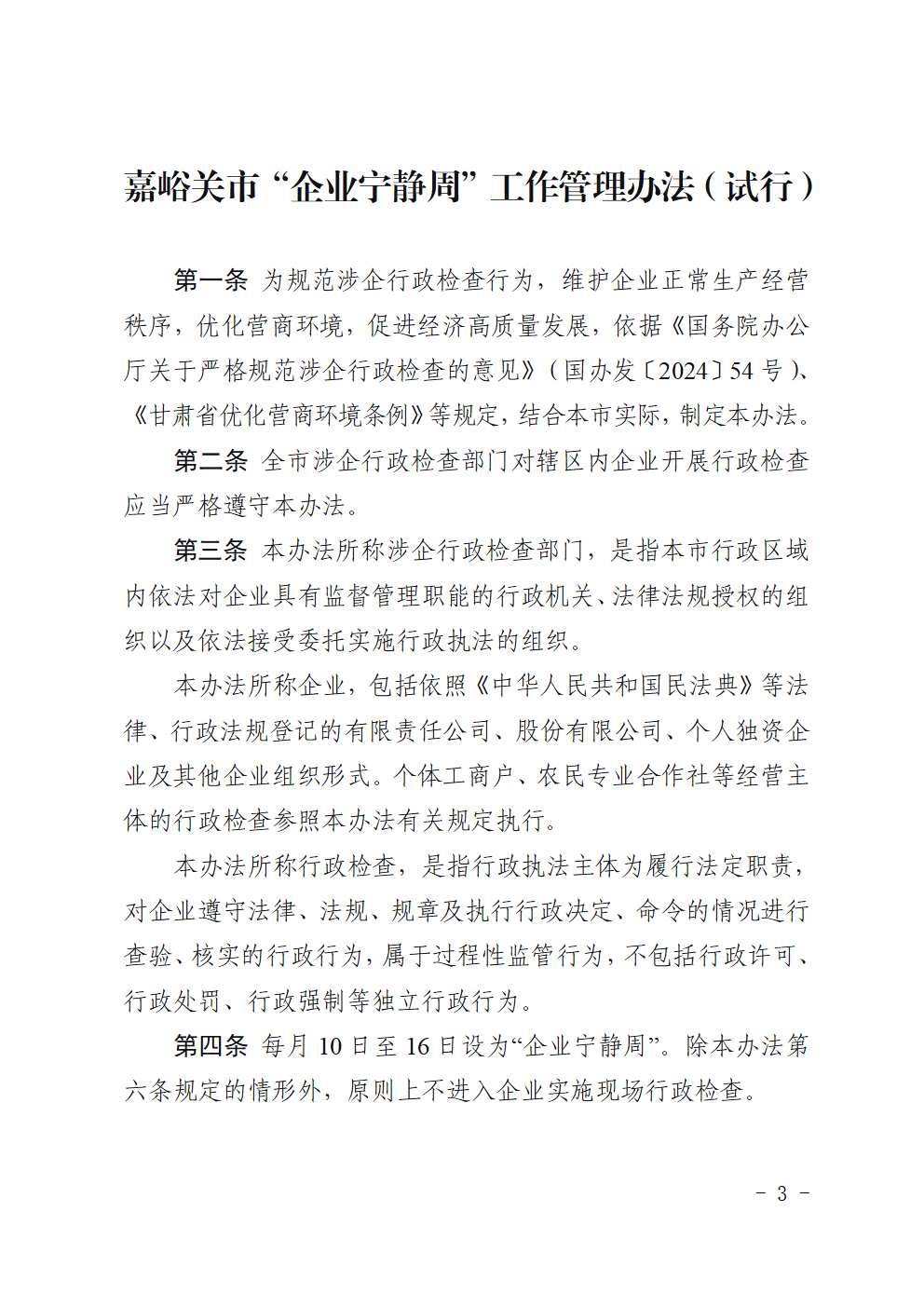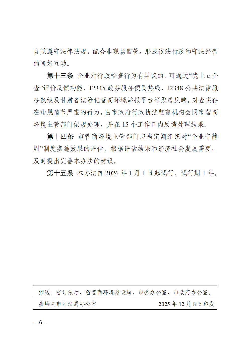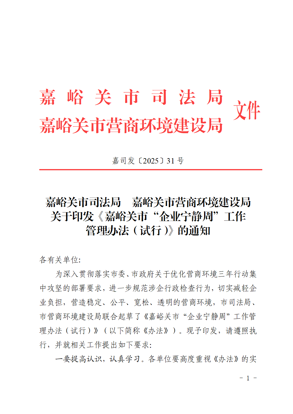 嘉峪关市司法局 嘉峪关市营商环境建设局关于印发《嘉峪关市“企业宁静周”工作管理办法(试行)》的通知