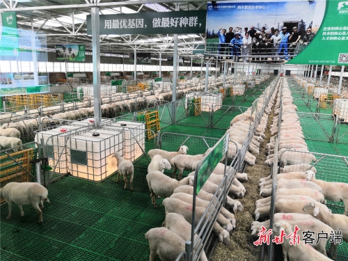环县庆环肉羊制种有限公司自动传输带饲喂羊场景。新甘肃·甘肃日报通讯员 李文